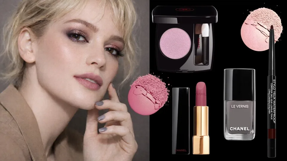 EYES: Rouge Noir Confidence Magenta Pink – No. 1 blended very lightly across lids for a cool-rose shimmer wash. Ombre Essentielle Gris Rose, pat inner lids to brighten and cool. Stylo Yeux Waterproof Rouge Noir diffused softly along upper and lower lash lines for depth with no harsh edge. Noir Allure Mascara Rouge Noir.