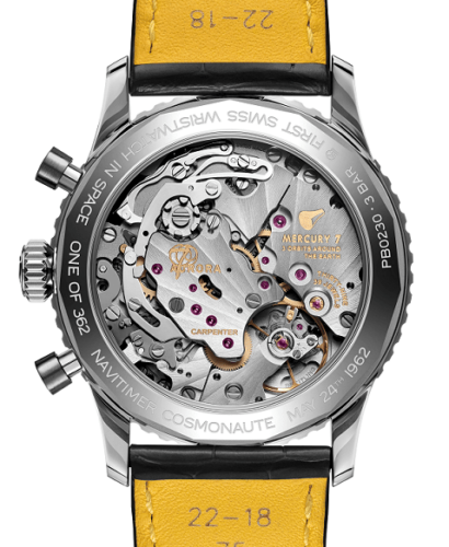 The same all-black 24-hour dial and reduced form tachymeter are kept, but the watch is now slightly smaller (at 41mm diameter) with a platinum bezel that is fluted (rather than beaded). The commemorative edition also features a sapphire back that provides a window on the B02 movement with its special bridge engravings to mark the occasion: the words “Carpenter,” “Aurora 7,” and “3 orbits around the Earth,” along with the Mercury space capsule. The commemorative edition is limited to 362 numbered pieces that recognise the number of orbits made by Carpenter (3) and the year in which he flew (’62). The watch is available on a black alligator strap or a seven-row stainless-steel bracelet.