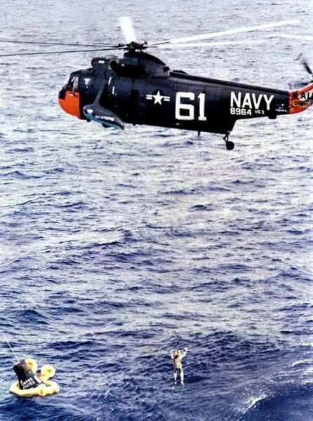 Scott Carpenter is hoisted aboard a Navy helicopter which flew him to the aircraft carrier USS Intrepid © NASA